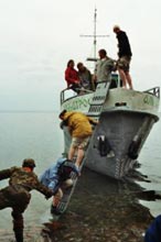 Nasse Füße holten wir uns auch noch beim traditionellen Landungsmanöver per Hühnerleiter. Campmanager Volodja erklärte uns, dass der Landesteg vom letzten Sturm zerstört wurde. In Anbetracht des von ihm in mehrtägiger Arbeit restaurierten Piers muss man bezweifeln, dass an diesem Strandabschnitt, wir nannten ihn wegen des schwierigen Landemanövers Omaha Beach, vorher je etwas Begehbares existiert hat.